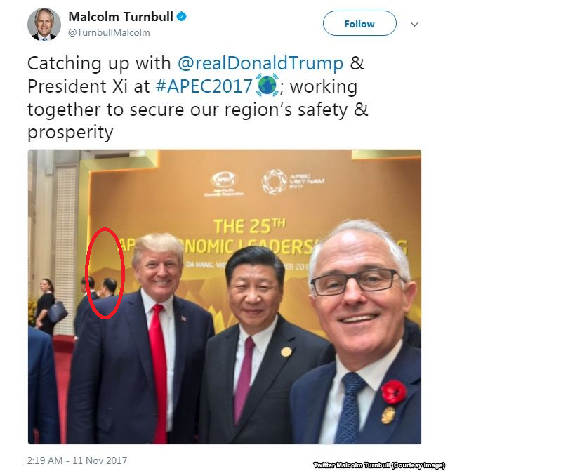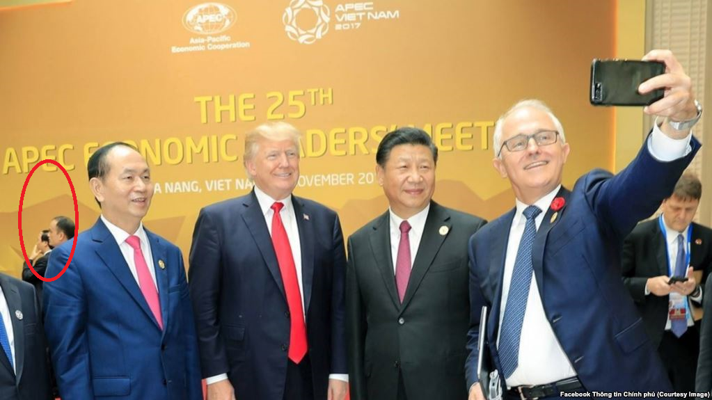 Vốn là trong thời gian giải lao của Hội nghị thượng đỉnh APEC 2017 tại Đà Nẵng, Thủ tướng Australia Turnbull đã selfie một tấm hình. Bối cảnh chụp gồm ông Malcolm Turnbull – Thủ tướng Australia, Chủ tịch Trung Quốc Tập Cận Bình, Tổng thống Mỹ Donald Trump và Chủ tịch nước Trần Đại Quang. Tuy nhiên, tấm hình khi ông Turnbull đăng tải trên Twitter cá nhân lại chỉ có ông ta, Chủ tịch Trung Quốc Tập Cận Bình và Tổng thống Mỹ Donald Trump, không có Chủ tịch nước Trần Đại Quang.