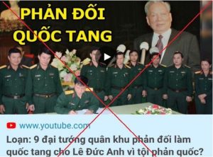 Bỉ ổi hơn nữa, các thế lực thù địch đã sử dụng hình ảnh 9 đồng chí của Phòng Chính trị thuộc Bộ Chỉ huy Quân sự tỉnh Quảng Ngãi đang ký kết chương trình triển khai nhiệm vụ quốc phòng, quân sự năm 2018 (đăng trên trang tin điện tử của Bộ CHQS tỉnh Quảng Ngãi) để làm hình nền cho đoạn video “Loạn 9 đại tướng quân khu phản đối làm quốc tang cho nguyên Chủ tịch nước Lê Đức Anh” đăng trên kênh youtube với nội dung xuyên tạc công lao to lớn của nguyên Chủ tịch nước Cộng hòa xã hội chủ nghĩa Việt Nam, vị Đại tướng cầm quân tài ba và có trái tim nhân hậu của chúng ta.