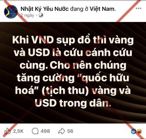 Mới đây, trên trang “Nhật ký yêu nước” có đoạn giật tít “Khi VND sụp đổ thì vàng và USD là cứu cánh, cứu cùng. Cho nên chúng tăng cường “quốc hữu hoá” (tịch thu) vàng và USD trong dân” đây là một kiểu suy diễn mang màu sắc kích động sợ hãi, thiếu cả cơ sở pháp lý lẫn logic kinh tế, gây hoang mang dư luận, làm ảnh hưởng đến uy tín, đi ngược với chính sách của Đảng và nhà nước ta.