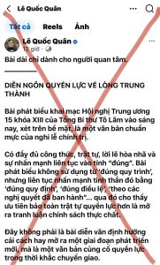 Bằng việc gán cho bài phát biểu của Tổng Bí thư nhãn “diễn ngôn quyền lực về lòng trung thành”, Lê Quốc Quân cố tình tạo ấn tượng rằng đây là văn bản nhằm “khóa chặt hệ thống” và “bảo toàn quyền lực cá nhân”. Đây là thủ pháp quen thuộc của diễn ngôn đối lập: dùng khái niệm trung tính, khoác hàm ý tiêu cực, rồi dẫn dắt người đọc đến kết luận đã được chuẩn bị sẵn.