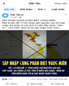 Đây là thông tin xuyên tạc và không có sự phân biệt vùng miền trong chủ trương sáp nhập. Việc sáp nhập các đơn vị hành chính cấp tỉnh là chủ trương của Đảng và Nhà nước ta nhằm tinh gọn bộ máy, nâng cao hiệu quả quản lý, không hề có yếu tố phân biệt vùng miền. Ban Chấp hành Trung ương Đảng đã ban hành Nghị quyết 60-NQ/TW ngày 12/4/2025 của Hội nghị lần thứ 11 Ban chấp hành Trung ương Đảng khoá XIII. Đồng ý số lượng đơn vị hành chính cấp tỉnh sau sáp nhập là 34 tỉnh, thành phố (28 tỉnh và 6 thành phố trực thuộc Trung ương). Trong đó, việc sắp xếp các đơn vị hành chính dựa trên hai tiêu chí bắt buộc: diện tích tự nhiên và quy mô dân số. Các tỉnh thành trên cả nước đều được rà soát và sắp xếp theo đúng tiêu chuẩn này, không có sự thiên vị bất kỳ vùng miền nào. Thông tin của các thế lực thù địch là sai lệch, bịa đặt, có tính chất kích động, bản đồ trong bài viết mang tính quy chụp và không phản ánh toàn cảnh chính sách hành chính quốc gia. Chúng lợi dụng sự thiếu thông tin để xuyên tạc, kích động mâu thuẫn giữa các vùng miền nhằm phá hoại khối đoàn kết dân tộc.