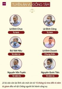 Tội “Chống người thi hành công vụ”: các bị cáo lĩnh từ 15 tháng tù (hưởng án treo) đến 6 năm tù giam. Cụ thể như sau: